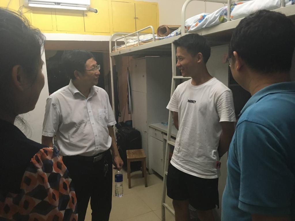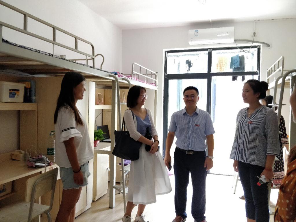 新生。张书记一行首先来到一楼,与宿舍管理员交流,了解楼栋学生分布和新生登记入住情况,并对宿舍管理员的辛勤工作表示感谢。