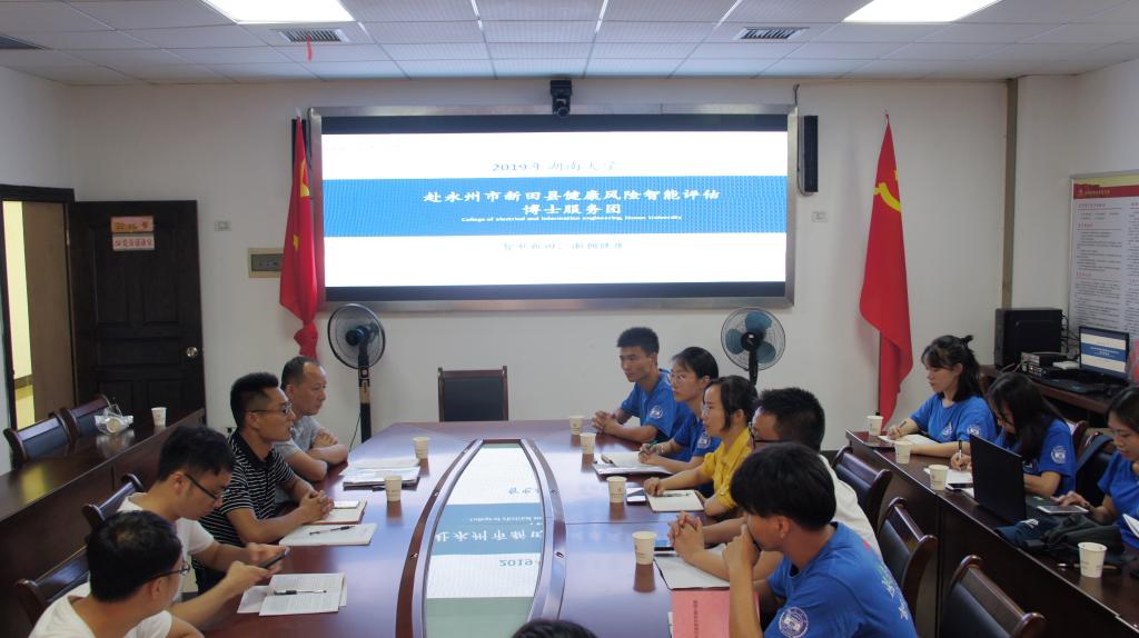 助理教授周骞、辅导员彭琪淋、硕博研究生、本科生一行18人组成的暑期三下乡博士服务团,赴湖南省永州市新田县政府扶贫办开展扶贫调研活动,双方就如何落实精准扶贫、科技扶贫等具体工作进行深入交流。扶贫办主任谢德勇、扶贫办副主任蒋贤鹏、扶贫办李超与刘畅出席了本次博士团调研座谈会。