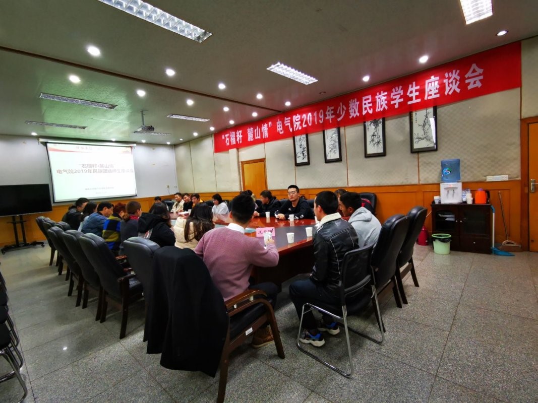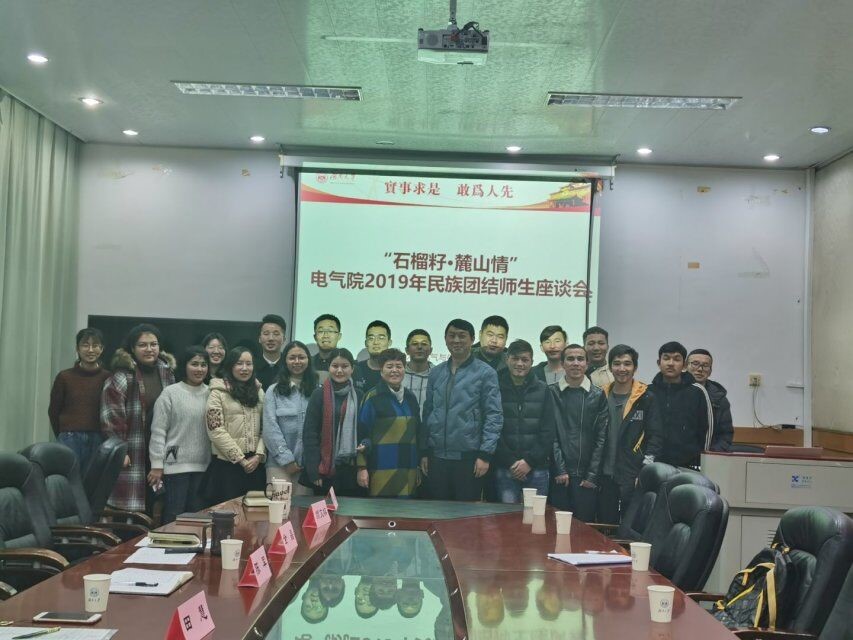 11月27日中午12:30,“石榴籽,麓山情”电气院2019年民族团结座谈会在院楼219会议室举行。学工部田慧老师、布阿提开姆老师和电气院陈军书记,以及各年级辅导员参加了座谈会。座谈会由第一会所