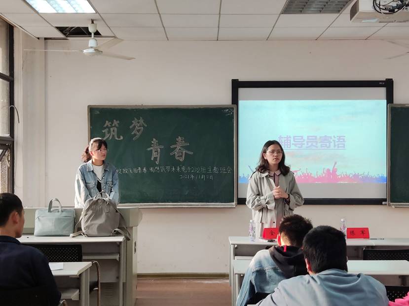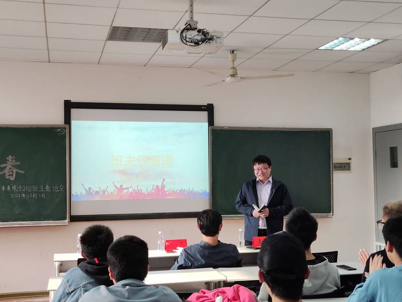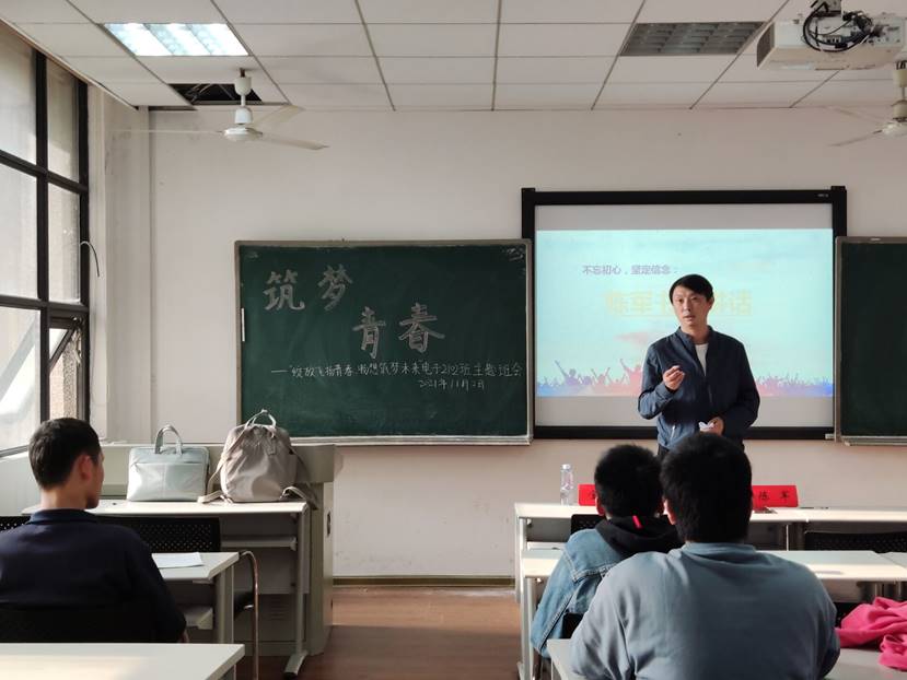 为引导同学们在大学新阶段中进一步明确目标树立理想,也为增强同学们的信念感与使命感,2021年11月2日16时,电子2102班于综合楼307举行“筑梦青春”主题班会。本次班会由团支书李子逸主持,宣传委员徐珮做会议记录,电子2102班全体同学参与。电气院党委副书记陈军老师、电子2102班班主任李皓老师与辅导员金晶老师出席本次班会。