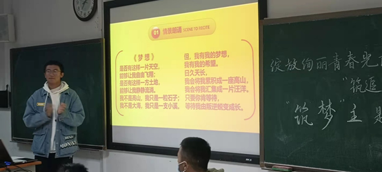 班会以电自2102班全体同学对自己大学梦的理解作为开场,其中不乏对自己人生的规划以及未来的期望。无疑,刚进入大学的同学们是迷茫的,如何与其更好的斗争,就是本次班会的意义所在。紧接着,由解涛同学进行《梦想》诗朗诵。“我会将我累积成一座高山,我会将我汇聚成一片汪洋!”朗诵声铿锵有力,掷地有声。燃起了同学们对大学梦的追求与渴望。