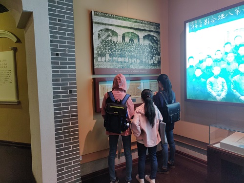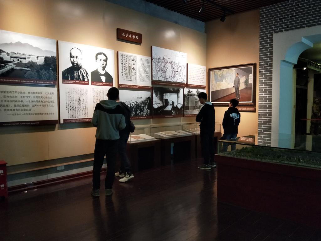 的学习经历的六个展厅,还有当时毛主席曾经上课的教室和寝室,最引人注目的还是那时的大礼堂,偌大的礼堂里整整齐齐地摆放着近百个长木椅,内置风扇,最前方则是一个大舞台,礼堂并没有开灯,显得有些昏暗,同学们在这些古朴建筑的屋檐下,发现除了有用来展示的教室和展厅,还有许多正在使用的教室,此时仍有学生在上自习,随着更加深入的参观,同学们发现现在的第一师范第一会所