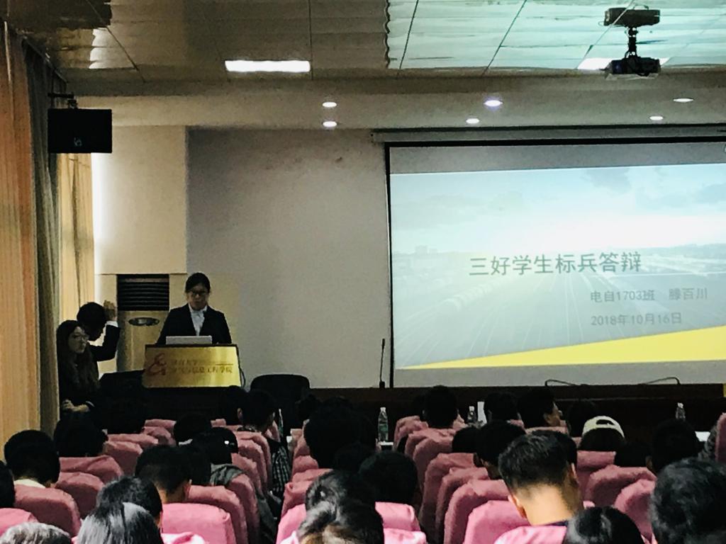 2018年10月16日下午的电气院院楼可谓热闹非凡,来自20个星级班级的答辩人与校三好标兵候选人齐聚一堂,进行个人与班级的答辩会。在本次答辩会中,电自1703班表现不俗,除了班级入选四星级班级之外,班级的优秀尖子生——滕百川也作为校三好标兵候选人进行了个人风采展示。
