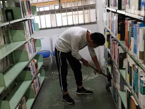 任务主要有以下几项,首先是图书馆卫生的清洁工作,包括拖地,擦书架和椅子等等。同学们按次序领到卫生工具后开始清扫。尽管图书馆的环境已经十分整洁,但在一些地方还是存在卫生死角。椅子上的横杆,书架的缝隙,这些容易藏匿灰尘的地方被大家发现并予以清洁。