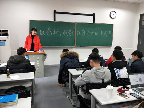 随后,班长郑宪光也进一步就改革开放这一主题展示自己的观点。我国第一届春节联欢晚会的播出恰逢改革开放,近四十年春晚在舞台、形式、道具、表演等方面的变化也能深刻反映改革开放的成果,郑宪光娓娓道来,对比历届春晚的各种不同,让大家更真切的感受改革开放在各种方面的成果。