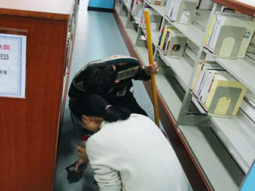 志愿者活动,以真诚为基,以认真作根,用求精益之心,行最简朴之事。同学们快速分工,开始投身于自己的工作任务当中。两位同学擦拭书架上堆积的灰尘,以让书籍得到最好的保存,以供需要的同学借阅。男同学力气大,韧性足,主要负责大面积的拖地,完成初步的清洁。而简单的拖地仍然达不到深层清洁的初衷,那些地面上明显突兀的深色划痕,主要是由鞋跟摩擦或者雨天鞋子底部沾染淤泥造成,破坏了图书馆的整洁性,所以相对心细的女同学就负责最大可能地恢复地面的原貌。按照老师的指导,同学们先用酒精润湿地面上的污迹,再用钢丝刷用力刷洗污迹,在通过反复的清洁后,图书馆的地面呈现接近崭新的状态。