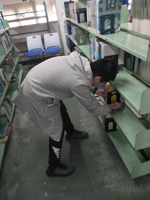 在团支书王胜辉的带领下,同学们精力充沛地来到了图书馆,图书馆依旧是充满学习氛围的图书馆,不时有学生前来自习。经过人员分配,大家前往各自工作的楼层,虽然大家有过做志愿者的经验,但本次活动与以往相比还是有了新的变化,第一是时间长度的变化,第二是出来基本的清洁工作外,还有了新的任务——书目放回,不少同学是没有这类工作的经验,但在图书工作人员的细心指导下,大家很快就了解了工作的步骤:按照索书号了进行书目的分类整理并熟悉各类书目的位置,接下来根据书本的索书号找到原位放回,或者找到相同书目,加快定位速度。了解了工作后,大家很快就将所有放还的书本放回,并再次仔仔细细地检查了一遍书摆放顺序并将书本摆放整齐。