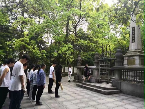 随后,同学们手捧鲜花,心怀敬意,登上岳麓山,寻找烈士墓,为烈士献上敬意。经过不懈努力,同学们最终到达了黄兴烈士墓前。看着位于岳麓山高处的黄兴墓,同学们不禁肃然起敬,列队整齐,怀着由衷的敬意在烈士墓前进行了三分钟默哀仪式。庄严的默哀结束后,两位同学代表大家为烈士献上鲜花,表达对先烈崇高的敬意。