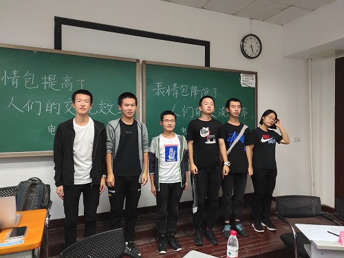 首先正反方各自进行自我介绍,并开始立论。电自2班作为正方首先进行立论。一辩选手语言精练,从表情包具有的独特性,趣味性,普遍性三个论点立论证明表情包会提高人们的交流效率。在反方三辩盘问过程中,正方一辩冷静作答,在坚持自己的论点同时适时抓住对方论点中的破绽予以反击,成功立论。