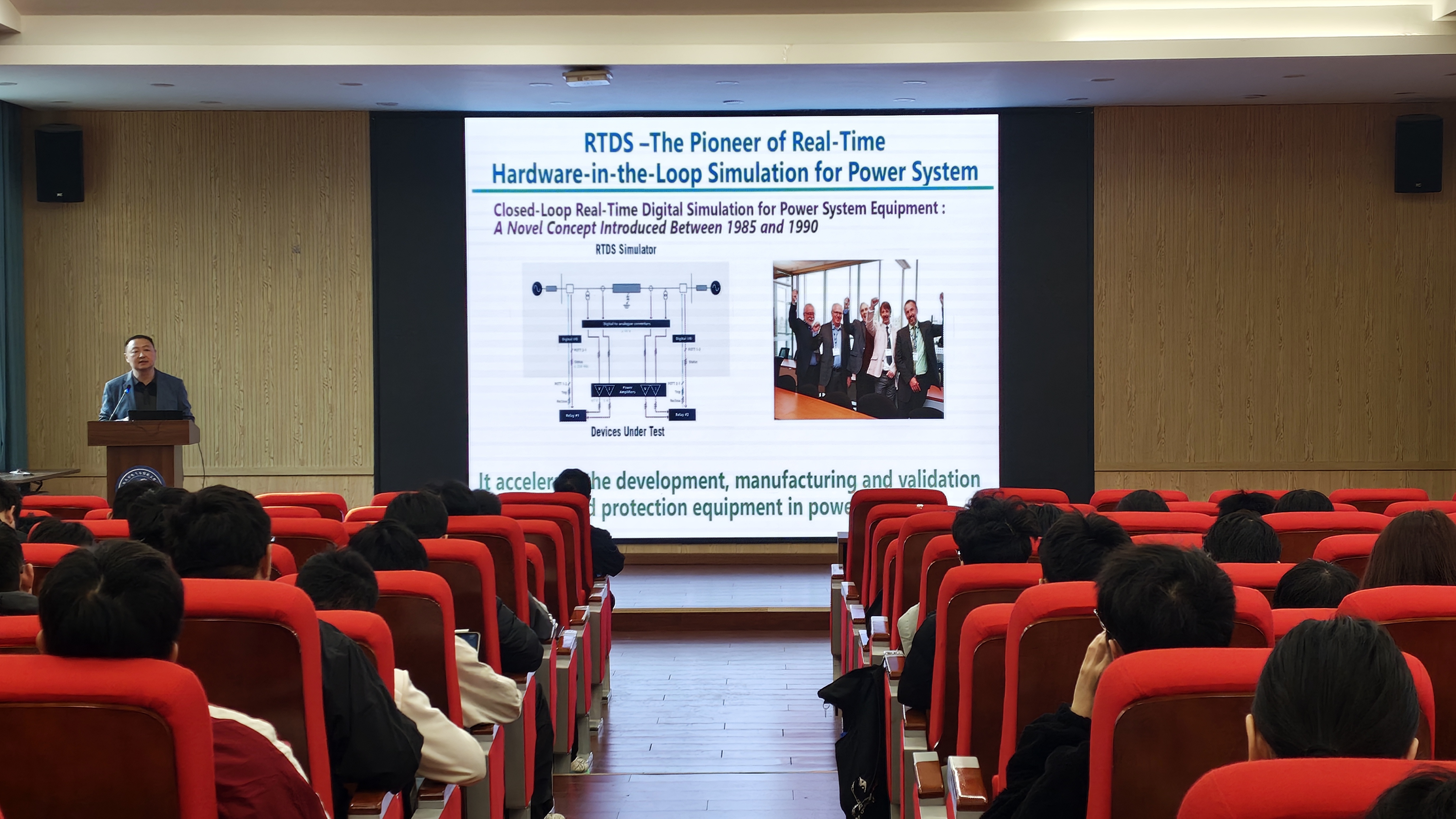 对张益院士的到来表示热烈欢迎,并简要介绍了他在电力系统实时仿真领域的国际影响力与重要贡献。本次报告的主题为“Modelling Data Center on Real Time Digital Simulator”(基于实时数字仿真器的数据中心建模)。张益院士从数据中心在现代电力系统中的作用切入,系统阐释了如何利用先进的实时数字仿真技术,对数据中心进行高效、精准的建模与分析,为师生带来了一场高水平的学术盛宴。