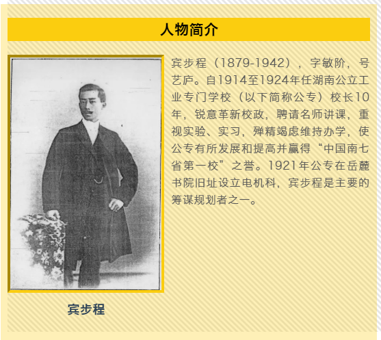 从清光绪三十年(1904)公布的《湖南省垣实业学堂章程》第一条规定:“本学堂教授之旨,以振兴实业,造成机械、采矿、冶金、应用化学、土木、电学各种人才为鹄”中提到要培养电学人才,到1921年公专在岳麓书院旧址设立电机科,均离不开公专领导的筹谋规划,其中以宾步程校长为最。