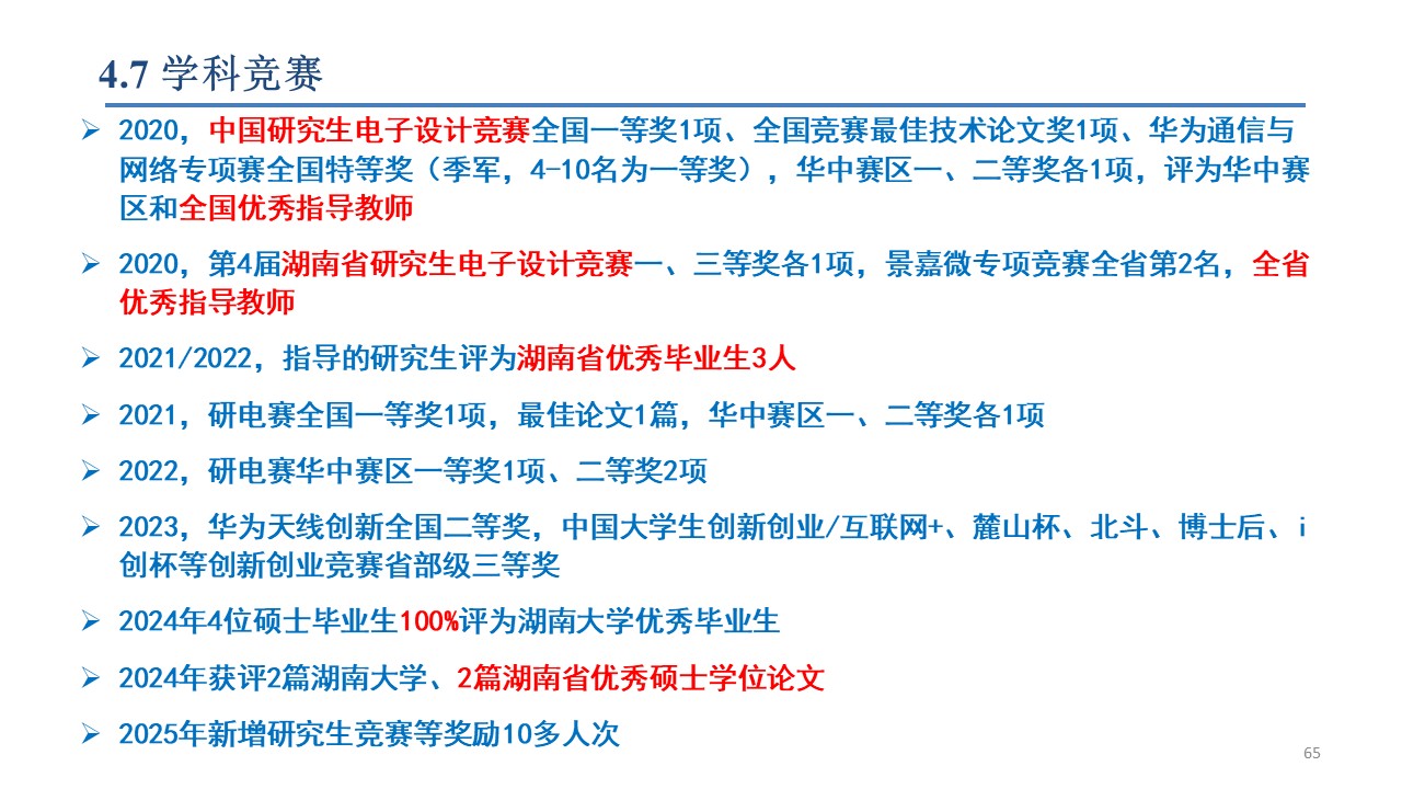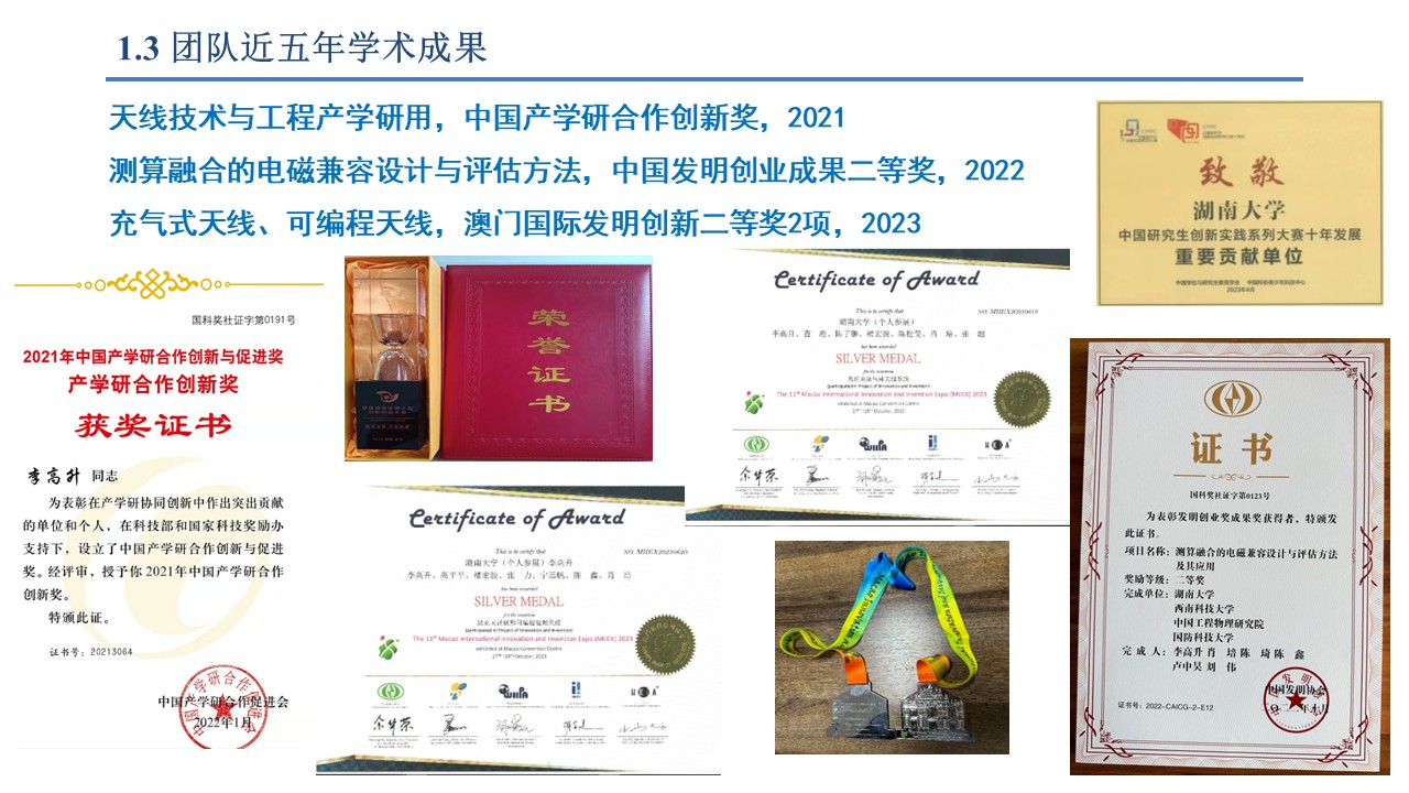 作为指导教师获得研究生电子设计竞赛全国一等奖(前1.4%)2项、二/三等奖各1项,全国研电赛最佳技术论文(前0.3%)2篇,华为通信与网络竞赛全国特等奖1项、天线创新赛全国二等奖1项、射频挑战赛全国三等奖2项,景嘉微杯电子设计竞赛全省特等奖1次,研电赛华中赛区一等奖7项、二等奖10多项,湖南省研电赛一/三等奖各1项、二等奖4项,全国学术会议优秀论文奖4项,湖南省电子学会优秀论文一等奖1项,互联网+/博士后/北斗应用/麓山杯/i创杯等创新创业大赛省部级奖励10多项,被评为全国优秀指导教师2次、湖南省优秀指导教师1次,第一会所