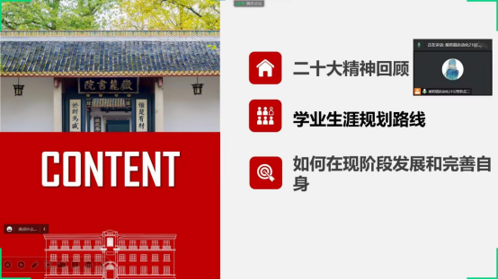 会议上,熊若锟同学说:"我们党百年已逾,流光延绵。走过荆棘沼泽,踏过雄关漫道,依旧在奋进的新征程上踔厉奋发,笃行不怠,在民族复兴之路上斗志昂扬,积极进取。党的历史长河里,标记着中华民族伟大复兴的铿锵步伐。江山就是人民,治国有常,立民为本,从中共一大到二十大,党的初心不改,始终坚持以人民为中心,带领人民奋勇前进,在党史上镌刻一部又一部壮丽的诗篇。"