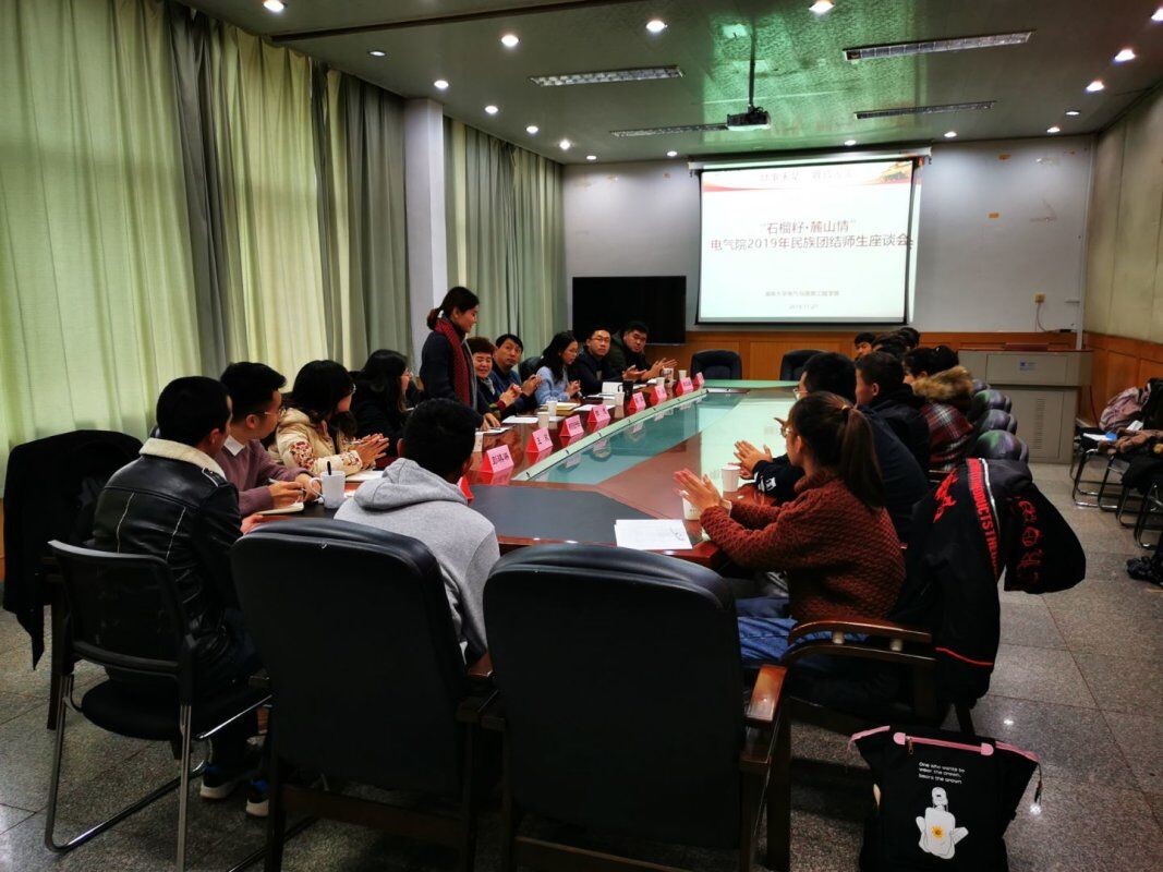 11月27日中午12:30,“石榴籽,麓山情”电气院2019年民族团结座谈会在院楼219会议室举行。学工部田慧老师、布阿提开姆老师和电气院陈军书记,以及各年级辅导员参加了座谈会。座谈会由第一会所