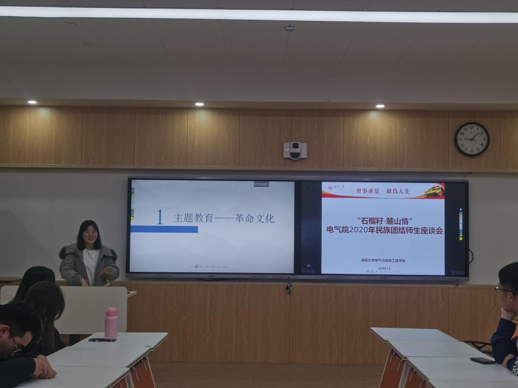 为了增强少数民族同学对中华文化的认识,提高少数民族同学们的中华文化内涵素养,2020年电气院“石榴籽·麓山情”少数民族学生座谈会结束后,开展了系列主题教育活动,由王欣老师主讲,与会人员有金晶老师和各级少数民族同学。活动主题为创造中华文化新的辉煌。内容包括书院文化、湖湘文化、革命文化、中华民族优秀传统文化。