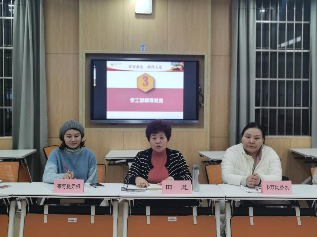 接下来,由田慧老师发言,田老师首先充分肯定了电气院的少数民族工作,之后结合自己多年的民族团结教育工作经历,向同学们提出在大学要学会四件事:一是学会读书;二是学会做事;三是学会与人相处;四是学会做人。田老师还特别讲述了一些疫情期间少数民族同学为社区服务做出贡献的例子,来鼓励同学们要学会感恩,对同学们寄予期望。