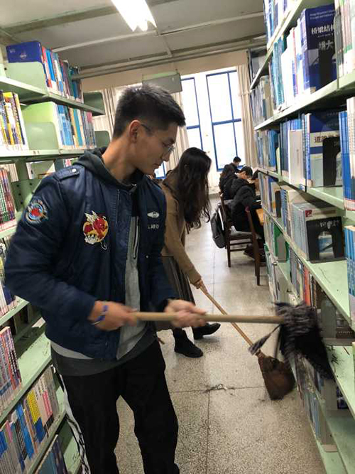 在七楼,男生们负责用拖把擦拭书架上的灰尘,女生们负责清扫各个过道。只见男生们轻舞拖把,快速又安静地工作着,那上下不断擦动的拖把仿佛一只放大的毛笔,这只毛笔在书架上轻轻书写着,似乎让整个书架又散发出知识的活力。女生们微低着头,仔仔细细地清扫着过道。汗水从同学们发间滑落,但这些汗水也无法浇灭他们内心的热情。