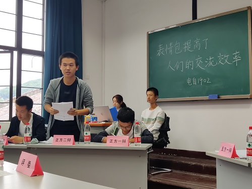 首先正反方各自进行自我介绍,并开始立论。电自2班作为正方首先进行立论。一辩选手语言精练,从表情包具有的独特性,趣味性,普遍性三个论点立论证明表情包会提高人们的交流效率。在反方三辩盘问过程中,正方一辩冷静作答,在坚持自己的论点同时适时抓住对方论点中的破绽予以反击,成功立论。