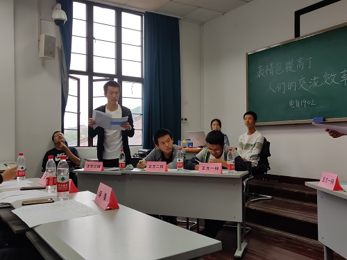 进行了2019年新生杯第三轮比赛。在近一个小时的比赛中,作为正方的电自1902班和作为反方的电自1904班“表情包会提高或降低人们交流效率”这一辩题展开激烈辩论,双方辩手逻辑清晰,语言犀利,共同完成了一场极为精彩的辩论比赛。