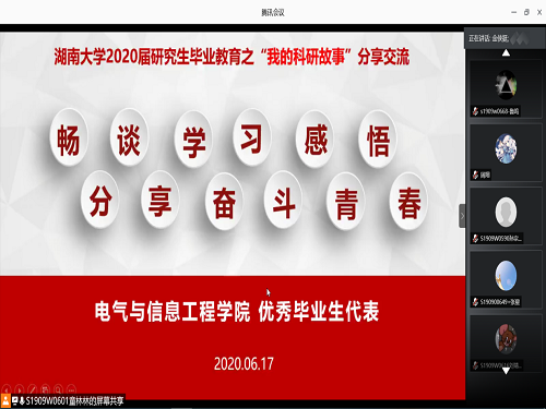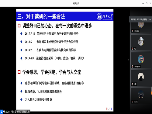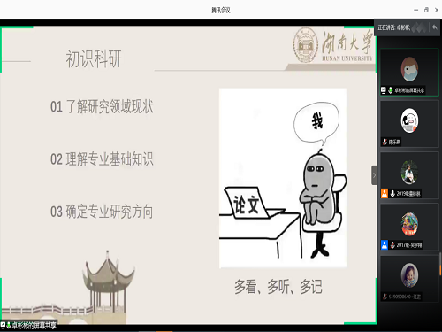 三位优秀毕业生:吴宇翔、卓彬彬、金侠挺进行科研就业经验分享。本次活动借助腾讯会议的平台线上举行,共260余名学生参加。