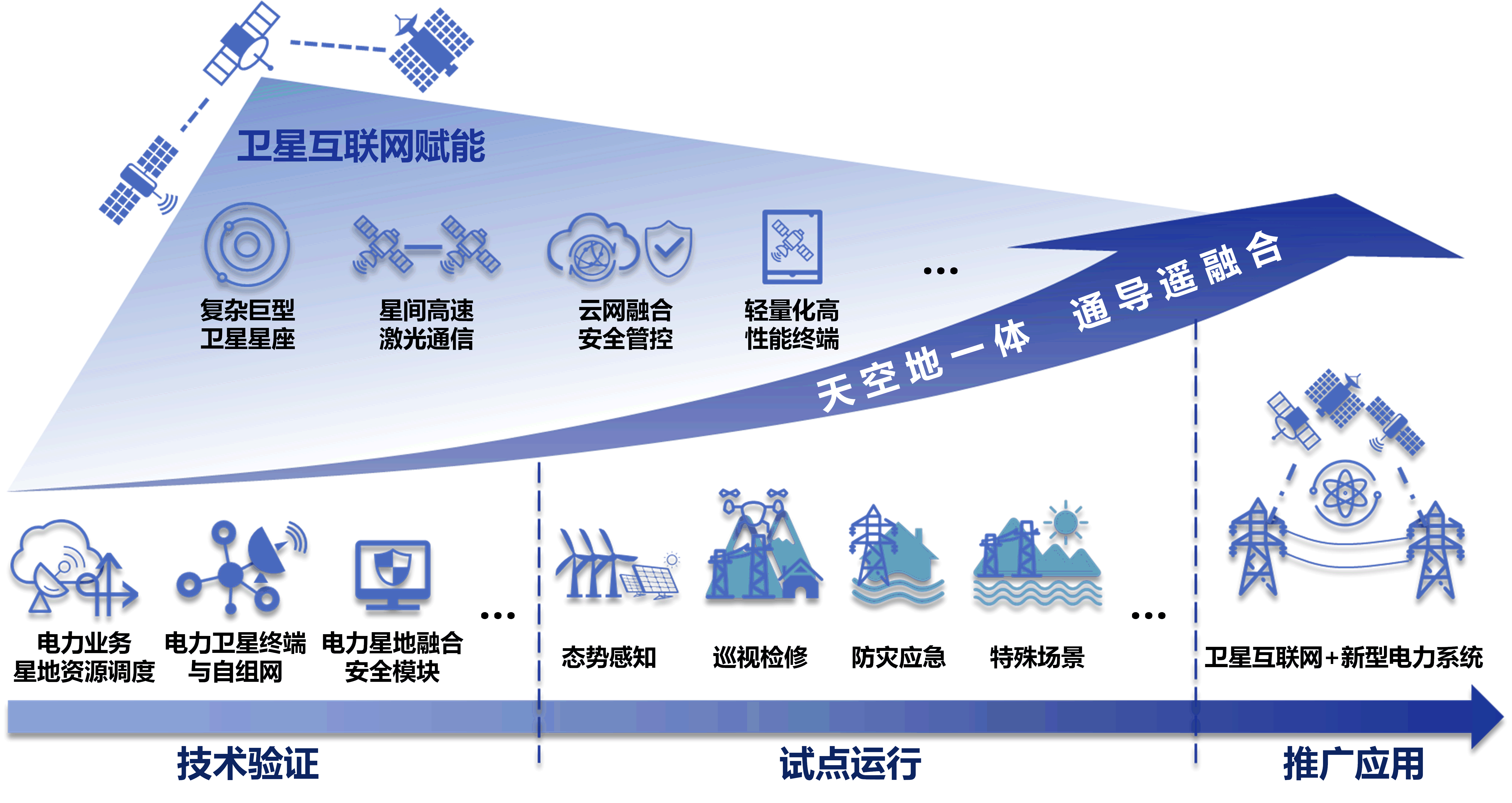 针对新型电力系统中海量分布式电源时空分布稀疏、系统运行状态时变等挑战,在卫星互联网通导感融合支撑下,开展星地融合网络架构、多元星地信息融合、星地资源协同调度等研究,赋能态势感知、规划运行、防灾应急、巡视检修等典型场景,实现新型电力系统广域智慧无人化升级迭代,替代现有高危性、重复性、适应性人工业务,支撑新型电力系统数字化、透明化、智能化运行。